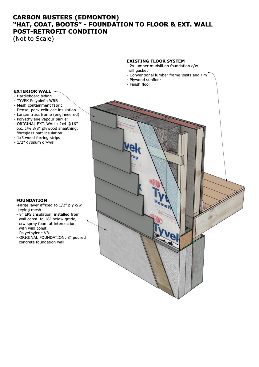 The project also had all windows upgraded to triple-pane, low-E, argon-filled models. Carbon Busters installed and sealed a continuous vapor barrier (6-mil poly with acoustic sealant). Additional sealing was applied at interfaces between the walls and attic.