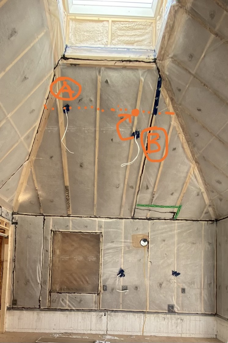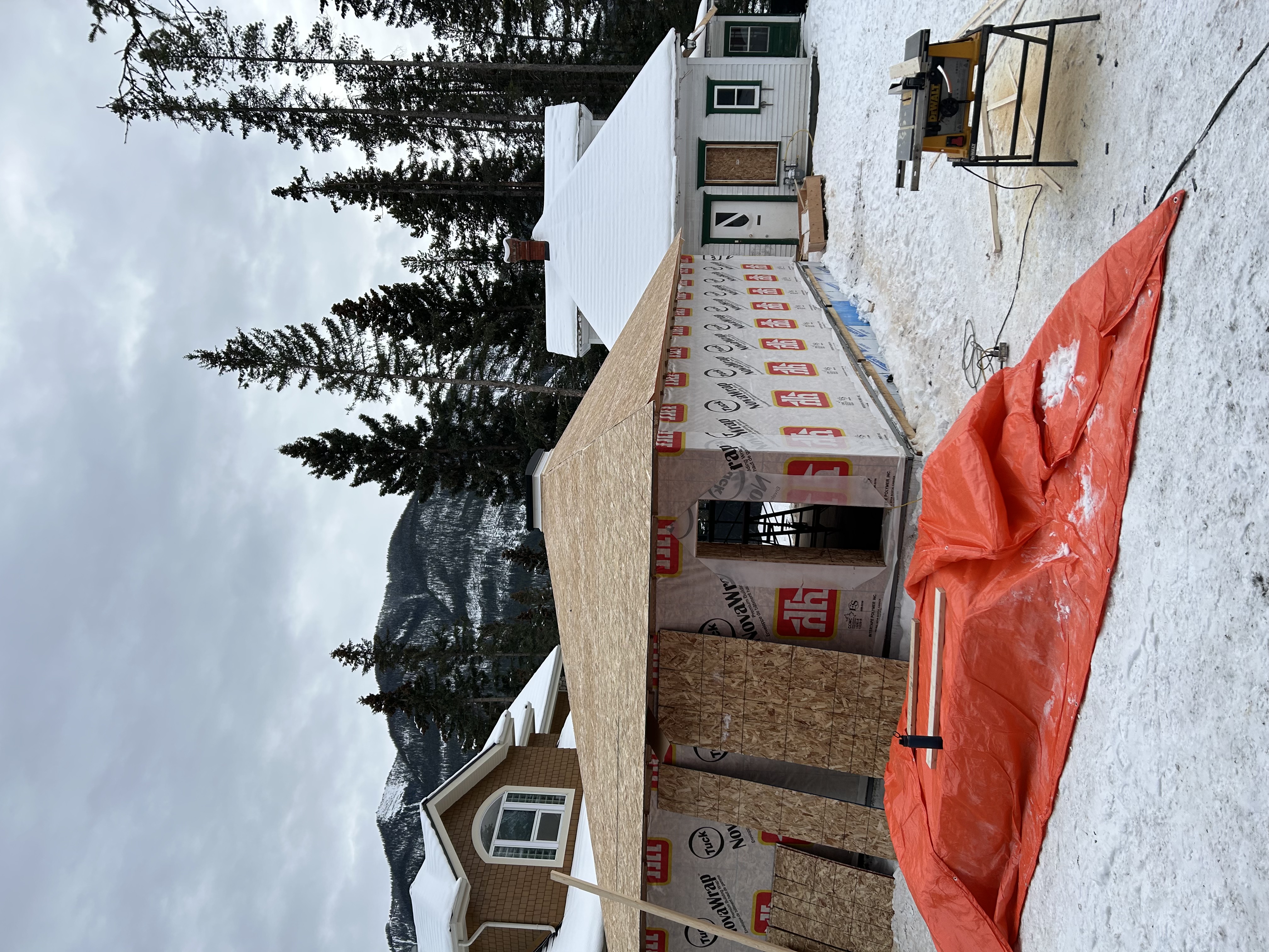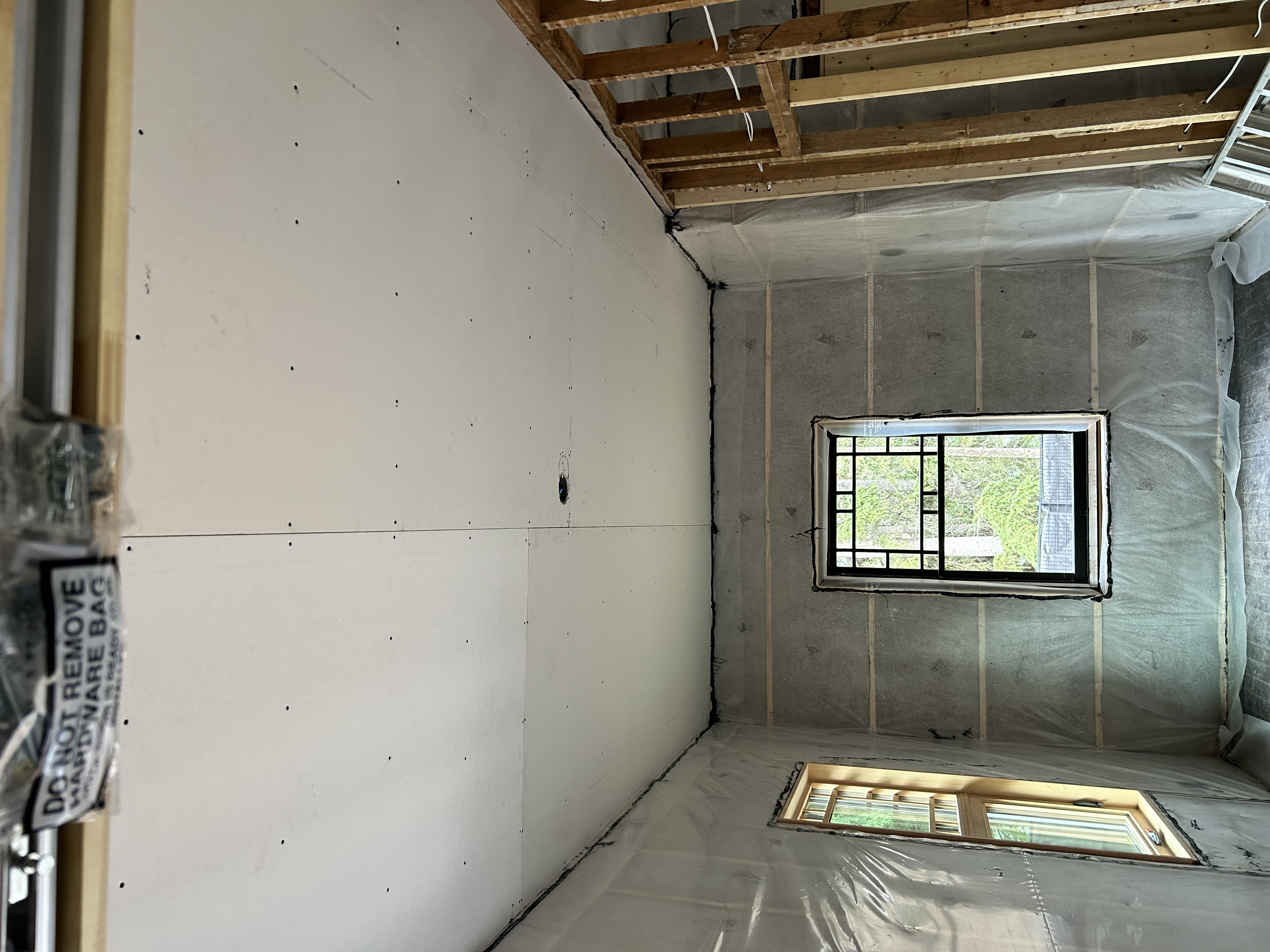 - Increased wall thickness, filled cavity with dense-packed cellulose, and added air/vapour barrier to boost insulation to R25.